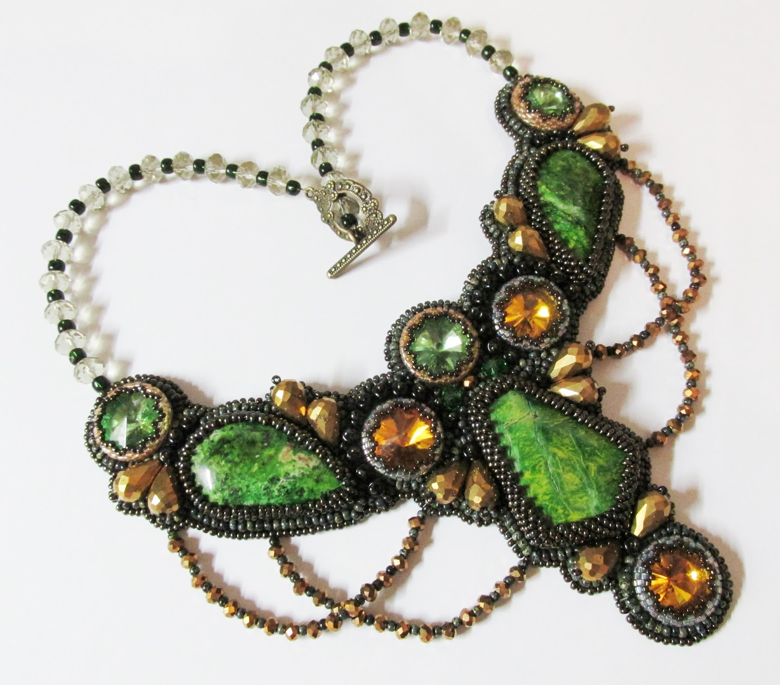 Кабошоны прессованной бирюзы, бисер чех, японец, риволи и бусины Китай.